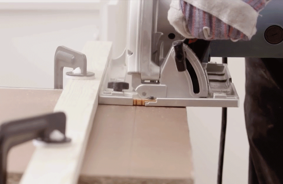 When ready to cut, make sure you wear a pair of protective goggles and gloves. Then cut the worktop with your circular saw in one smooth continuous motion. Do not stop halfway through as this may lead to splintering of the worktop and ruin the final finish.