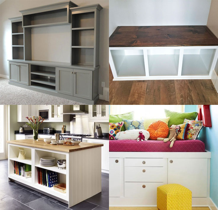 There’s nothing worse than having nowhere to store shoes, gloves and other items in hallways that are lacking in storage. A bench is easy to build using shallow height kitchen wall cabinets.